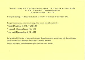 Rappel enquête publique sur le projet de Plan Local Urbanisme et sur le zonage d’assainissement